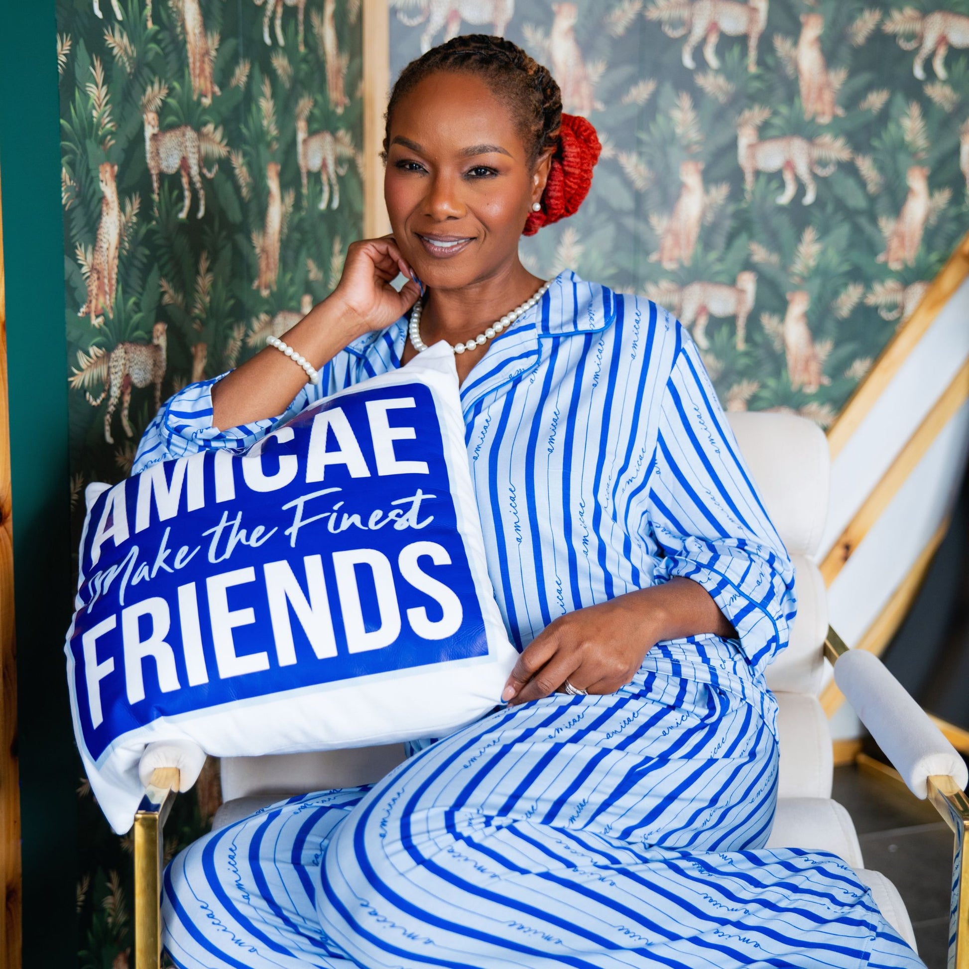 Relax in effortless style with the Amicae Pajama Set. Crafted from breathable modal cotton, this two-piece set includes a long-sleeve button-up top and pants for ultimate comfort. Styled in light blue with an all-over Amicae pattern and crisp white piping, it’s a cozy way to lounge while celebrating friendship. Perfect for quiet evenings, sleepovers, or self-care nights.