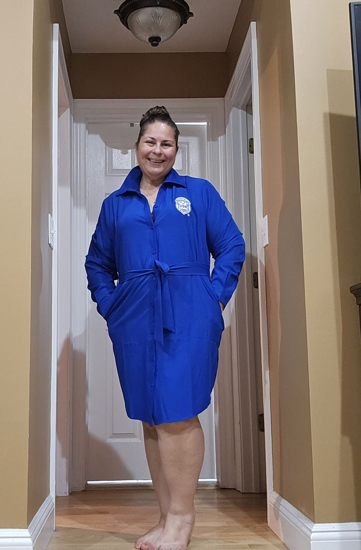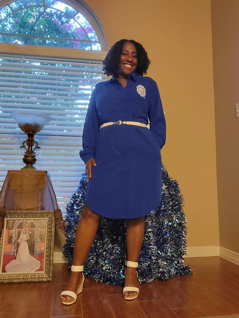 The Zeta Shield Button-Down Shirt Dress combines comfort and style effortlessly. This chic dress, crafted in the iconic royal blue of Zeta Phi Beta, features a flattering mid-thigh length that keeps it finer.